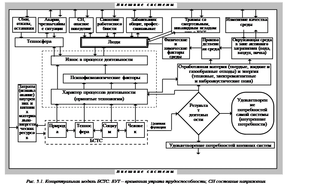 При такой постановке анализ опасности должен включать: · сопоставление уровня достижения целевой функции возможному (желаемому, идеальному). При анализе опасности (безопасности) функционирования БСТС в разряд важнейших показателей уровня рисков следует отнести так называемый «результат +», то есть уровень достижения основной целевой функции деятельности – обеспечение необходимых и достаточных условий для реализации жизни (обеспечение приемлемого уровня жизни). Ведь согласитесь, что бессмысленно заниматься решением инженерно-технических задач по борьбе с проявлением неблагоприятных событий в то время, кода система в целом функционирует так, что не выполняет свою основную целевую функцию; · описание состояния системы в целом и условия возможности функционирования каждого отдельного элемента; · уровни рисков, которые имели место при достижении целевой функции, для отдельных элементов БСТС и системы в целом. Человеку в БСТС отведена особая роль. Эта особая роль определена наличием у человека разума, его способностью к анализу и творчеству, целенаправленной деятельности. Человек «создает» («строит») себя, техносферу, социум. Это еще раз подчеркивает тот факт, что задача об управлении рисками может быть переформулирована следующим образом: как и в каких направлениях изменить жизнедеятельность людей, чтобы снизить риск. Мы тем ближе подойдем к оптимальному («правильному») решению, чем глубже будем понимать глобальные законы жизни, а самое главное следовать им. Это произойдет только в том случае, если БЖД будет развиваться как научное знание и не будет подвержена ни идеологии, ни политике. Только тогда мы будем заниматься не симптомами, а причинами событий и явлений. Возможно, роль человека, его высшее предназначение и сводится к творческой, целенаправленной деятельности по поиску эффективных способов функционирования БСТС и постоянной корректировке своей деятельности. Концептуальная модель БСТС (см. рис. 3.1) может быть применена к системе любой иерархии, в том числе на уровне техноэкополиса любого масштаба и отдельного предприятия. Модель демонстрирует как структуру БСТС, так и ее функционирование, и характер возможных проблем. Целевая функция системы достигается, если созданы необходимые и достаточные условия для функционирования системы в целом. Это основной результат деятельности системы и он может быть получен, если: · удовлетворены потребности внешних систем в результатах деятельности данной системы; · удовлетворены внутренние потребности системы, связанные с необходимостью поддержания в «рабочем» состоянии ее отдельных элементов. Дополнительными (их часто называют «отрицательными») результатами деятельности системы являются естественный износ (затраты, использование) основных элементов системы в процессе деятельности и естественный сброс отработанной материи и энергии, обусловленный глобальными процессами материально-энергетического обмена. Таким образом, при выполнении целевой функции результат деятельности системы можно представить состоящим из следующих частей: · удовлетворения внутренних потребностей самой системы, связанных с необходимостью поддержания отдельных элементов и системы в целом в «рабочем» состоянии; · удовлетворения потребностей внешних систем; ·