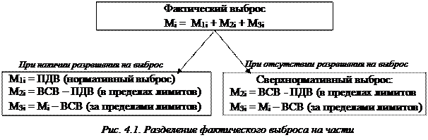 Платы за выбросы в атмосферу загрязняющих веществ Платы за выбросы в атмосферу загрязняющих веществ от стационарных источников могут быть определены следующим образом: П = Квоздух * Кинфл S(БНП1i * М1i + БНП2i * М2i + Кпов * БНП2i * М3i); Мi = М1i + М2i + М3i. Здесь Мi – общее количество выбрасываемого в воздух i-го вещества за отчетный период, т. Если определяется плата за квартал, то и Мi определяется за квартал, если определяется плата за год, то и Мi определяется за год. Суммирование производится по ингредиентам; М1i – количество выбрасываемого в воздух i-го вещества за отчетный период в пределах установленных нормативов (ПДВ), т; М1i = ПДВ; М2i – количество выбрасываемого в воздух i-го вещества за отчетный период в пределах установленных лимитов (превышение ПДВ), т; М2i = ВСВ – ПДВ; М3i – сверхлимитное количество выбрасываемого в воздух i-го вещества за отчетный период (превышение ВСВ), т. М3i = Мi – ВСВ; БНП1i, БНП2i – базовые нормативы платы за загрязнение воздушной среды Таблица 4.1 Нормативы платы за выбросы в атмосферу загрязняющих веществ