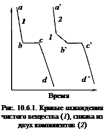 Сплав – это система с металлическими свойствами, состоящая из двух или более металлов (один компонент может быть неметаллом). Вопросы химического взаимодействия металлов между собой, а также с неметаллами, если продукты их взаимодействия сохраняют металлические свойства, изучает один из разделов неорганической химии – металлохимия. Если расположить металлы в порядке усиления их химического взаимодействия друг с другом, то получится следующий ряд: – компоненты не взаимодействуют друг с другом ни в жидком, ни в твердом состоянии; – компоненты взаимно растворяются в жидком состоянии, а в твердом состоянии образуют эвтектику (механическая смесь); – компоненты образуют друг с другом жидкие и твердые растворы любого состава (системы с неограниченной растворимостью); – компоненты образуют между собой одно или несколько металлических соединений, называемых интерметаллическими (система с образованием химического соединения). Для изучения физических свойств сплавов в зависимости от их состава широко используют физико-химический анализ. Это позволяет обнаружить и изучить происходящие в системе химические изменения. О химических превращениях в системе можно судить по характеру изменения разнообразных физических свойств – температур плавления и кристаллизации, давления пара, вязкости, плотности, твердости, магнитных свойств, электрической проводимости системы в зависимости от ее состава. Из различных видов физико-химического анализа более часто применяют термический анализ. В ходе анализа строят и изучают диаграммы плавкости, которые представляют собой график зависимости температуры плавления системы от ее состава. Чтобы построить диаграмму плавкости, берут два чистых вещества и готовят из них смеси различного состава. Каждую смесь расплавляют и затем медленно охлаждают, отмечая через определенные промежутки времени температуру остывающего сплава. Таким образом получают кривую охлаждения. На рис. 11.6.1. приведены кривые охлаждения чистого вещества (1) и сплава (2). Переход чистого вещества из жидкого в твердое состояние сопровождается выделением теплоты кристаллизации, поэтому, пока вся жидкость не закристаллизуется, температура остается постоянной (участок bс, кривая 1). Далее охлаждение твердого вещества идет равномерно.