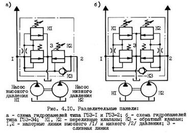 В гидросистемах в ряде случаев взамен отдельных аппаратов применяются более компактные и надежные комбинированные аппараты - гидропанели и клапанные коробки целевого назначения. Эти устройства в одном корпусе могут содержать направляющие и регулирующие гидроаппараты. В качестве примеров рассмотрим разделительные гидропанели. Для сокращения потерь мощности питание гидроприводов часто осуществляют от двух насосов. При этом возникает задача автоматического переключения насосов в зависимости от расхода масла, потребляемого гидроприводом в тот или иной момент цикла. Для случаев, когда давление в гидроприводе изменяется в зависимости от нагрузки (при быстрых перемещениях рабочего органа давление пониженное, а при рабочих ходах – высокое), панель (рис.4.10,а) может обеспечивать подачу масла во время быстрых перемещений от двух насосов, а во время рабочего хода – от одного, обеспечивающего малую подачу масла под высоким давлением. Гидропотоки в такой панели будут следующими: - при холостом ходе: - при рабочем ходе давление в линии 1 возрастает, клапан К2 открывается и насос Н2 разгружается: (Н2)2(К2)3(Б); в результате линия 1 питается только от насоса Н1: