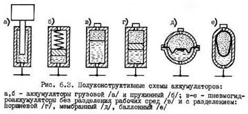 Аккумулятор – это ёмкость, предназначенная для аккумулирования энергии масла, находящегося под давлением. Конструктивные схемы аккумуляторов даны на рис. 6.3.