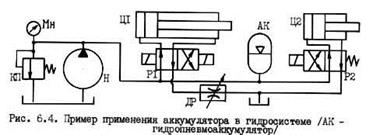 Для питания Ц1, работающего, например, в течение 120 с, достаточно иметь подачу насоса 2,5 л/мин, а для Ц2 в течение 3 с требуется подача насоса 18 л/мин. Без использования аккумулятора необходимо установить насос Н с подачей 25 л/мин, причем практически в течение всего времени работы большая часть масла, подаваемого насосом, будет сливаться в бак через переливной клапан КП, не производя полезной работы, что приведет к интенсивному разогреву масла в гидроприводе. Применение аккумулятора АК позволяет использовать насос с подачей 5 л/мин. При работе Ц1 масло, подаваемое насосом, заполняет аккумулятор и в небольшом количестве сливается в бак через клапан КП. При переключении распределителя Р2 масло поступает в цилиндр Ц2 одновременно от насоса и аккумулятора, что обеспечивает высокое значение мгновенной подачи масла.