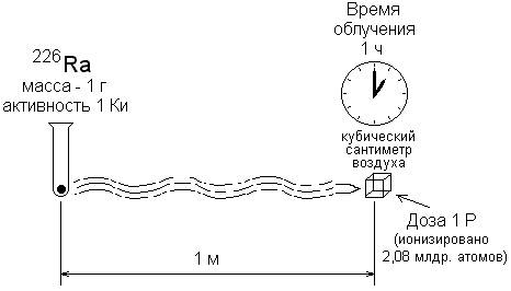 Частицы и гамма-излучение, испускаемые радионуклидами, ионизируют окружающую среду: воздух, если радионуклид окружен воздухом, воду, строительные материалы, продукты питания. Когда радионуклиды находятся в человеческом организме, излучения ионизируют биологические ткани. Все это не проходит бесследно для облучаемого вещества. Дозиметрия – наука, изучающая взаимодействие ионизирующих излучений с облучаемым веществом. Для оценки эффекта воздействия ионизирующих излучений на окружающую среду и биологические ткани используется несколько дозиметрических величин. Экспозиционная доза X – энергия ионизирующего излучения, поглощенная в единице массы облучаемого воздуха за время облучения. При облучении атомы газов, из которых состоит воздух, ионизируются, что приводит к появлению заряженных частиц. Единицей измерения экспозиционной дозы (в СИ) является Кулон на килограмм (Кл/кг). Внесистемной единицей измерения является рентген (Р), названный в честь немецкого физика Вильгельма Рентгена. 1 Р соответствует такой энергии ионизирующего излучения, при поглощении которой в одном кубическом сантиметре облучаемого сухого воздуха (при температуре 0 С и давлении 760 мм ртутного столба) образуется 2,08 миллиардов пар ионов (ионизируется 2,08 млрд. атомов). Доза 1 Р накапливается в кубическом сантиметре воздуха в течении часа на расстоянии 1 м от радиоактивного источника – образца чистого радия-226 массой 1 г (рис. 5).