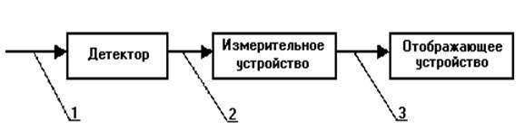 Рис. 1. Блок-схема прибора радиационного контроля: 1 – поток ионизирующих излучений; 2 – слабый электрический импульс; 3 – усиленный импульс