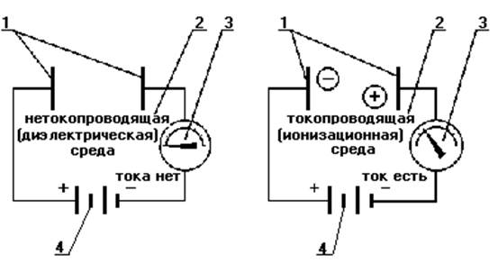 Рис.3. Схема принципа действия измерителя мощности дозы ДП-5В: а – процесс подготовки к работе; б – процесс работы; 1 – электроды конденсатора; 2 – ионизационная камера; 3 – микроамперметр; 4 – источник питания.