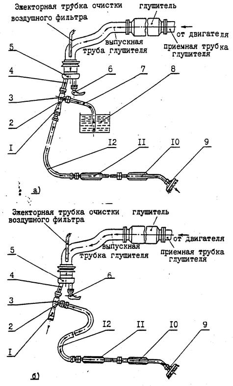 Рис. 2. Схема компоновки газожидкостного прибора комплекта ДК-4КУ: а) для газожидкостного метода обработки; б) для обработки методом отсасывания пыли; 1 – диффузор; 2 – патрубок; 3 – эжектор; 4 – газоотборник; 5 – крышка; 6 – рычаг; 7 – жидкостный рукав; 8 – емкость; 9 – щетка; 10 – брандспойт; 11 – удлинитель; 12 – газожидкостный рукав 3.4. Сборка газожидкостного прибора комплекта ДК-4КУ, для обработки методом отсасывания радиоактивной пыли, проводится согласно схемы (рис. 2б) в следующей последовательности: 3.4.1. Выполнить пункты 3.3.1. и 3.3.2. 3.4.2. Соединить газожидкостный рукав 12 с патрубком 2, эжектора 3. 3.4.3. Выполнить пункты 3.3.4.