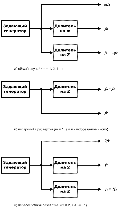 где n - целое число. Задающая часть синхрогенератора вырабатывает импульсы с частотами mf Z, f Z, f П, которые называются ведущими. На их основе вырабатываются все необходимые сигналы (синхронизирующие, гасящие, уравнивающие импульсы). Структурная схема задающей части синхрогенератора в общем случае (при любой кратности перемежения m) представлена на рисунке 1а. Наиболее широко в прикладном телевидении применяются построчная (m = 1) и в вещательном чересстрочная (m = 2) развертки. Принципиально возможно построение растра с m > 2, однако практически такие развертки не используются. Структурная схема синхрогенератора для построчной развертки приведена на рисунке 1б. В этом случае частота полей f П равна частоте кадров f K. Для обеспечения незаметности мельканий частота кадров должна быть не менее 40 –60 Гц, что при Z = 625 соответствует полосе частот видеосигнала 12,5 МГц.