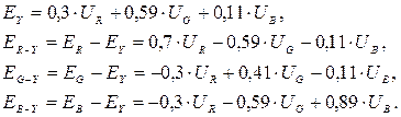 и подать эти сигналы на модуляторы «красного», «зелёного» и «синего» прожекторов трёхцветного кинескопа. Напомним также, что возможен и другой равнозначный способ воспроизведения этого цвета на экране цветного телевизора, при котором из сигналов цветоделенных изображений UR, UG, UB формируется яркостный сигнал ЕY и три цветоразностных сигнала ER-Y, EG-Y, EB-Y. При опорном белом (равносигнальном) цвете С (Х= 0,31; Y = 0,316) выражения для этих сигналов имеют вид: