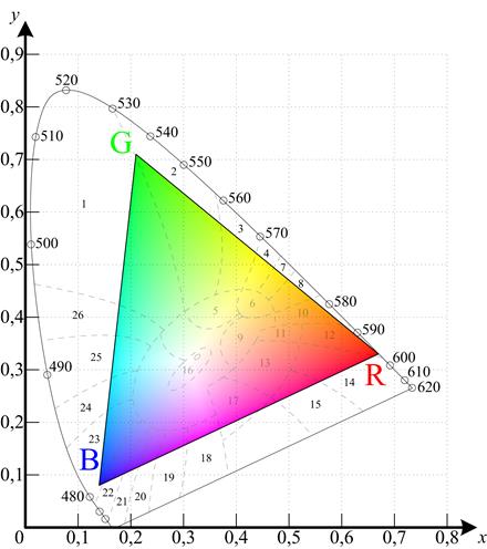 Цвета расположенные за пределами треугольника не могут быть отображены ни какими средствами телевидения и полиграфии. 1 – Зелёный; 2 – Морская волна; 3 – Жёлто-зелёный; 4 – Жёлтый; 5 – Оливковый; 6 – Хаки; 7 – Жёлто-оранжевый; 8 – Охра; 9 – Бежевый; 10 – Оранжевый; 11 – Светло-оранжевый; 12 – Киноварь; 13 – Розовый; 14 – Красный; 15 – Кармин; 16 – Область белого; 17 – Гранатовый; 18 – Пурпурный; 19 – Сиреневый; 20 – Фиолетовый; 21 – Индиго; 22 – Тёмно-синий; 23 – Синий; 24 – Сапфировый; 25 – Небесно-голубой; 26 – Изумрудный. Рисунок 1 – Треугольник основных цветов на цветовом графике МКО в координатной системе XYZ в которое вместо x′, y′, z′ следует подставлять найденные по цветовому графику значения трёхцветных коэффициентов x y z. Здесь Аn - квадратная матрица, элементами которой являются координаты цветов X Y Z в колориметрической системе R G B. При опорном белом цвете С матрица Аn имеет вид: