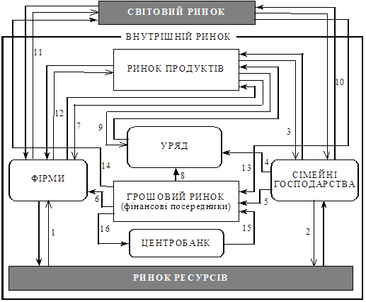 2. Грошові потоки та їх балансування Оскільки більшість відносин між економічними суб’єктами здійснюється через ринки, в моделі виділено чотири види ринків: ринок продуктів, на якому реалізується створений фірмами національний продукт; ринок ресурсів, на якому фірми купують необхідні для забезпечення виробництва ресурси (робочу силу, земельні ділянки, будівлі тощо); грошовий ринок, на якому реалізуються вільні грошові кошти; світовий ринок. Грошові потоки пов’язують між собою не тільки всі групи економічних суб’єктів, а й усі види ринків, забезпечуючи У наведеній вище моделі сукупного грошового обороту виділено 16 окремих грошових потоків. Першим (під номером 1) визначено сукупність платежів (витрат) фірм, пов’язаних з купівлею виробничих ресурсів, насамперед робочої сили, земельних ділянок, споруд, інших засобів виробництва. Назустріч цьому потоку грошей рухаються в напрямку фірм куплені ресурси, що позначено тонкою зустрічною лінією. Звичайно, щоб цей потік відбувався, фірми повинні мати необхідну кількість грошей. Звідки вони їх беруть? У попередньому параграфі ми вже розглядали це питання стосовно кругообороту індивідуального капіталу. Тому припустимо на цьому етапі аналізу, що фірми мають гроші й успішно оплатили всі закупівлі виробничих ресурсів. Простежимо подальший рух грошей у моделі (рис. 2.1). У результаті грошового потоку 1 відбудеться реалізація ресурсів, запропонованих на ринок сімейними господарствами, та сформуються грошові доходи останніх, які відображені в моделі як потік 2. У цьому потоці враховані такі види доходів сімейних господарств: заробітна плата, гонорари, виручка від продажу матеріальних цінностей (сільськогосподарської продукції, земельних ділянок, будівель тощо), рента, доходи за акціями, паями та ін. У сукупності вони складають національний дохід країни. У подальшому національний дохід розподіляється на три частини, кожна з яких породжує окремий грошовий потік. Більша його частина витрачається сімейними господарствами на споживання, у зв’язку з чим оплачується закупівля продуктів на внутрішньому ринку продуктів і на світовому ринку. Ці платежі створюють потоки 3 та 10. Певна частина національного доходу сплачується сімейними господарствами уряду у вигляді податків, що створює потік 4. Цей потік істотно відрізняється від попередніх потоків — він не супроводжується зустрічним переміщенням реальних цінностей, тобто він належить до групи суто фінансових потоків. Не витрачена на споживання та сплату податків частина національного доходу становить заощадження сімейних господарств, які надходять на грошовий ринок і створюють потік 5. Заощадження населення в даній моделі виступають узагальнюючим джерелом надходження коштів на грошовий ринок, а отже — узагальнюючим джерелом інвестування розширення виробництва в секторі «фірми». Це зумовлено тим, що, згідно з нашим припущенням, весь прибуток фірм надходить сімейним господарствам як їхнім власникам у вигляді дивідендів та процентів, тобто входить до складу національного доходу. Тому у фірм не залишається коштів для розширення свого капіталу і вони мобілізують їх на грошовому ринку. У зв’язку з цим формується грошовий потік 6, в якому враховані кредити, одержані фірмами у фінансових посередників, доходи від емісії цінних паперів (ак
