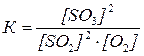 Уравнение константы равновесия показывает, что в условиях равновесия концентрации всех веществ, участвующих в реакции, связаны между собой. Изменение концентрации любого из этих веществ влечет за собою изменения концентраций всех остальных веществ; в итоге устанавливаются новые концентрации, но соотношение между ними вновь отвечает константе равновесия. Константа равновесия зависит от природы веществ, температуры, но не зависит от концентраций. Для гомогенной реакции 2 SO2(г) + O2(г) константу равновесия химической реакции выражают уравнением:
