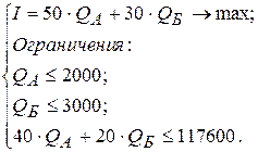 Определить объёмы выпуска продукции вида А и вида Б, максимизирующие прибыль предприятия. Решение: Обозначим искомые объёмы выпуска продукции Тогда целевая функция, направленная на поиск решения, максимизирующего маржинальную прибыль предприятия, будет иметь следующий вид: На искомые объемы выпуска продукции накладываются ограничения по максимальным объёмам продаж: