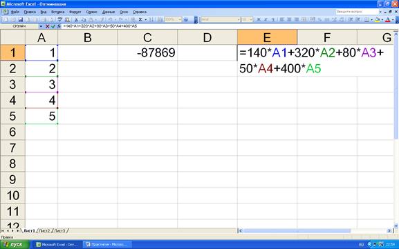 Рисунок 5.2. Запись целевой функции в программе EXCEL.