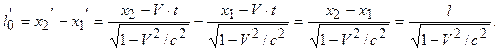 Це означає, що довжина стрижня залежить від швидкості його руху щодо системи відліку. Якщо V<<c, то підкорінний вираз прямує до одиниці і l=l 0, тобто, при малих швидкостях руху довжина стрижня у всіх ІСВ однакова. Якщо V ® с, то чим більша швидкість руху стрижня щодо будь-якої ІСВ, тим менша його довжина, виміряна в цій системі. Цей ефект має назву Лоренцева скорочення довжини. Отже, довжина тіла у напрямку руху не є інваріантною величиною, а залежить від швидкості руху тіла відносно даної ІСВ. Незмінним є лише твердження про те, що тіло, яке покоїться, завжди довше за рухоме (власна довжина тіла максимальна). Причому, це стосується тільки розмірів тіла у напрямку руху. Його поперечні розміри не залежать від швидкості руху і однакові у всіх ІСВ, що безпосередньо виходить із перетворень Лоренца. 3) Відносність часових проміжків (тривалостей). Нехай у деякій точці простору із координатою х, нерухомою щодо системи О (x 2 =x 1), відбувається будь- яка подія, тривалістю t 0 =t 2 -t 1 (вона визначається різницею показів годинника цієї системи у момент її початку та закінчення). Тоді, в рухомій системі О ¢ тривалість події становить t=t 2¢- t 1¢, причому початок і закінчення події фіксуються за “своїм” годинником, але в різних точках простору (х ¢1¹ х ¢2). Застосувавши перетворення Лоренца для часу і взявши їхню різницю, матимемо: