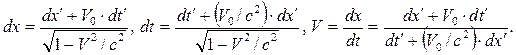 Розділивши чисельник і знаменник правої частини третього співвідношення на dt ¢, одержимо релятивістський закон додавання швидкостей: