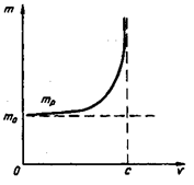 Цей результат знаходиться у відповідності до принципу сталості швидкості світла: при додаванні будь-яких швидкостей результат не перевищує швидкості світла у вакуумі, а саме світло поширюється із однаковою швидкістю с з погляду будь-якого спостерігача. Легко переконатись, що при швидкостях V, V 0 та V ¢, малих у порівнянні зі швидкістю с, то релятивістський закон додавання швидкостей переходить у класичний закон додавання швидкостей. Зі спеціальної теорії відносності випливають два важливі наслідки, які стосуються взаємозв'язку між масою і швидкістю, масою та енергією. До Ейнштейна маса розглядалась, як стала величина. Але у 1901 році фізиками було винайдено, що маса швидкорухомих електронів зростає при збільшенні їхньої швидкості. При швидкостях руху частинок, малих порівняно зі швидкістю поширення світла, зростання їхньої маси помічене не було. Згідно із теорією відносності, маса тіла має різні значення залежно від швидкості його руху і від вибору ІСВ, у якій виконують її вимірювання. Залежність маси m рухомого тіла від швидкості V його руху