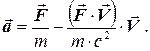 На відміну від класичної механіки, у релятивістській механіці прискорення в загальному випадку не співпадає за напрямом із спричиняючою його силою. Вони співпадають тільки у двох випадках: 1) На матеріальну точку діє поперечна сила, яка спричиняє зміну швидкості тільки за напрямком (нормальне прискорення), а модуль швидкості і релятивістська маса не змінюються. Оскільки F ^ V, то і скалярний добуток (F×V)= F×V× × cos(p/ 2) = 0, тоді: