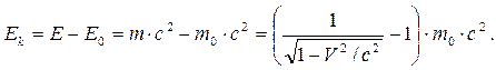 У релятивістській динаміці кінетична енергія визначається разницею повної енергії рухомого тіла та його енергії спокою: