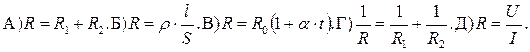 А) I=I 1 +I 2; U=U 1 =U 2; R=R 1 +R 2. В) I=I 1 =I 2; U=U 1 +U 2; R=R 1 +R 2. Б) I=I 1 =I 2; U=U 1 +U 2;