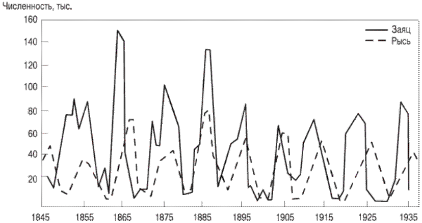 Рис. 3.5. Изменение численности рыси и зайца ¾ классический пример В настоящее время уже достаточно моделей, подтверждающих логистическую модель, как на чисто природных объектах, так и на природно-антропогенных. Например, А. М. Гиляров (1990) приводит сведения о размножении северных оленей, интродуцированных (вселенных в местообитания, где они раньше не проживали) на острова Берингова моря. С небольших когорт, состоящих из нескольких десятков особей, в течение ряда лет рост численности по экспоненциальному закону приводил к возникновению популяции оленей, состоящей из нескольких тысяч голов. Затем наблюдалось резкое падение численности тоже до нескольких десятков голов за короткое время, один - три года. Причина ¾ полный расход пищевых ресурсов, которыми обладали эти острова.