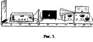 Установку собирают по рисунку 3. Генератор и экран располагают на расстоянии 1—1,5 м друг от друга. Между ними помещают приемный диполь. Включив генератор, медленно перемещают диполь вдоль распространения электромагнитных волн до момента наступления максимального сигнала. Затем по той же линии перемещают экран в пределах 1—2 см, добиваясь максимального сигнала. При перемещении приемного диполя вдоль выбранной линии наблюдают ярко выраженные минимумы и максимумы сигнала. Для определения длины электромагнитной волны диполь устанавливают в точке максимума (или минимума) сигнала. Замечают его положение. Затем перемещают диполь вдоль линии распространения электромагнитных волн, отсчитывая одновременно 20 максимумов. Замечают положение диполя при двадцатом максимуме. Измеряют расстояние между выделенными положениями и подсчитывают длину волны.