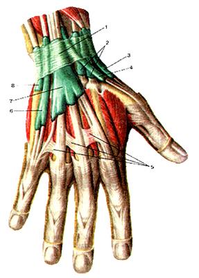 Рисунок 133. Синовиальные влагалища сухожилий мышц-разгибателей кисти (vaginae synoviales tendinum). Тыльная сторона. 1 - удерживатель сухожилий мышц-разгибателей; 2 -синовиальные влагалища сухожилий мышц — длинного и короткого лучевых разгибателей запястья; 3 - синовиальное влагалище сухожилий длинной мышцы, отводящей большой палец кисти и короткого разгибателя большого пальца; 4 - синовиальное влагалище мышцы-длинного разгибателя большого пальца кисти; 5 - межсухожильные соединения; 6 - синовиальное влагалище сухожилия мышцы-разгибателя мизинца; 7 - синовиальное влагалище сухожилий мышцы-разгибателя пальцев; 8 - синовиальное влагалише сухожилия мышцы-локтевого разгибателя запястья.