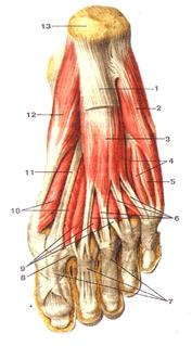 Рисунок 153. Мышцы тыльной стороны стопы, правой. Вид сверху. 1 - сухожилие передней большеберцовой мышцы; 2 - медиальная лодыжка; 3 - мышца-короткий разгиба-тель большого пальца стопы; 4 - сухожилие мышцы-длинного разгибателя большого пальца стопы; 5 - мышца, отводящая большой палец стопы; 6 - тыльные межкостные мышцы; 7 -сухожилие мышцы-короткого разгибателя пальцев; 8 - мышца, отводящая мизинец; 9 -сухожилие мышцы-длинного разгибателя пальцев; 10 - сухожилие третьей малоберцовой мышцы; 11 - мышца-короткий разгибатель пальцев; 12 - нижний удерживатель сухожилий мышц-разгибателей; 13 - латеральная лодыжка; 14 - мышца-длинный разгибатель пальцев; 15 - мышца-длинный разгибатель большого пальца стопы; 16 - верхний удерживатель сухожилий мышц-разгибателей.