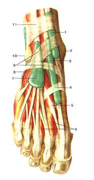 Рисунок 156. Синовиальные влагалища сухожилий пальцев стопы (vaginae synoviales tendinum). Тыльная сторона правой стопы. 1 - синовиальное влагалище сухожилия передней большеберцовой мышцы; 2 - медиальная лодыжка; 3 - синовиальное влагалище сухожилия мышцы-длинного разгибателя большого пальца стопы; 4 - нижний удерживатель сухожилий мышц-разгибателей; 5 - мышца-короткий разгибатель большого пальца стопы; 6 - тыльные межкостные мышцы; 7 - синовиальное влагалище сухожилий мышц-разгибателей пальцев; 8 - мышца-короткий разгибатель пальцев; 9 - нижний удерживатель сухожилий мышц-разгибателей; 10 - латеральная лодыжка; 11 - верхний удерживатель сухожилий мышц-разгибателей.