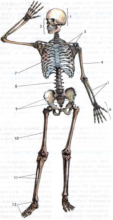 1 – мозговой череп 2 – лицевой череп 3 – кости пояса верхней конечности 4 – плечевая кость 5 – кости предплечья 6 – кости кисти 7 – грудная клетка 8 – позвоночный столб 9 – кости пояса нижних конечностей 10 – бедренная кость 11 – кости голени 12 – кости стопы Рис. 12. Скелет человека (вид спереди):