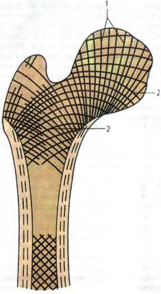 Рис. 16. Схема расположения костных перекладин в губчатом веществе костей (распил верхнего конца бедренной кости): 1 – линии сжатия (давления) 2 – линии растяжения