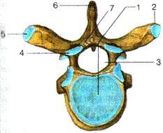 1 – тело позвонка, 2 – поперечный этросток, 3 – позвоночное отверстие, 4 – верхний суставной отросток, 5 – реберная ямка поперечного отростка, 6 – остистый отросток, 7 – дуга позвонка