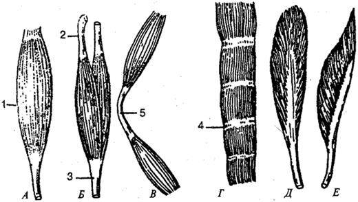 Рис. 54. Форма мышц: А — веретенообразная; Б — двуглавая мышца; В — двубрюшная мышца; Г— мышца с сухожильными перемычками; Д — двухперистая мышца; Е— одноперистая мышца; 1— брюшко мышцы; 2, 3— сухожилия мышцы; 4 — сухожильная перемычка; 5 — промежуточное сухожилие Чаще встречаются веретенообразные мышцы. В них пучки волокон ориентированы параллельно длинной оси мышцы, а брюшко, постепенно сужаясь, переходит в сухожилие. Мышцы, у которых мышечные волокна прикрепляются к сухожилию только с одной стороны, называются одноперистыми, а с двух сторон — двухперистыми. Мышцы могут иметь одну или несколько головок, отсюда и название: двуглавая, трехглавая, четырехглавая. Некоторые мышечные волокна расположены циркулярно и образуют мышцы сфинктеры, которые окружают ротовое и заднепроходное отверстия и др. Название мышцы может отражать ее форму (ромбовидная, трапециевидная, квадратная), размер (длинная, короткая, большая, малая), направление мышечных пучков или самой мышцы (косая, поперечная), выполняемую ею функцию (сгибание, разгибание, вращение, поднимание). По отношению к суставам мышцы располагаются неодинаково, что определяется их строением и функцией. Если мышцы действуют на один сустав, они называются односуставными, если же перекидываются через два сустава и больше — двусуставными и многосуставными. Некоторые мышцы могут брать начало от костей и прикрепляться к костям, не соединяясь при помощи суставов (например, подъязычная, челюстно-подъязычная, мимические мышцы, мышцы дна рта, мышцы промежности).