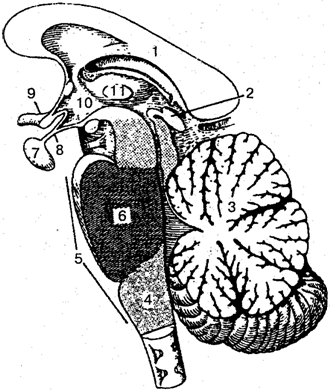 Рис. 116. Ромбовидный мозг (саггитальный разрез):