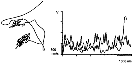 Рис. 25.1.1а. Хватательные движения пациента с атактическим двигательным расстройством к стеклянной бутылке, стоящей перед ним на столе. Слева двигательный путь запястья в сагиттальном разрезе, справа — соответствующие кривые скорости. При этом рука сначала придвигалась к бутылке и потом в течение нескольких секунд выполняла осциллирующие движения, прежде чем схватить предмет