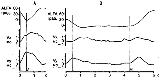 Чтобы проанализировать координацию этого сложного движения, Ингварссон и др. (Ingvarsson et al., 1986) засняли движения специальной видеосистемой и затем рассчитали траектории и скорость для предмета и участвующих суставов. Рис. 25.2.2 показывает угол подъема руки (ALFA) и горизонтальную (Vx) и вертикальную (Vy) скорость предмета в ходе движения.