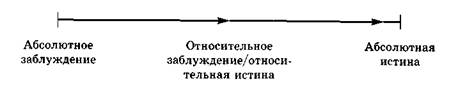 Все в мире имеет свои количественные градации. Не являет- ся исключением и истина. Наши знания, информация как сово- купность сведений постоянно возрастают. По мере развития процесса познания становится известным ранее неведомое. Вве- дем шкалу истинности — от крайне левой точки, соответствую- щей абсолютному заблуждению, до крайне правой точки, соот- ветствующей абсолютной истине. Рост знания означает, что че- ловечество перемещается по шкале истинности слева направо (про- тивоположностью истины является заблуждение; ложь — это пред- намеренное искажение истины).