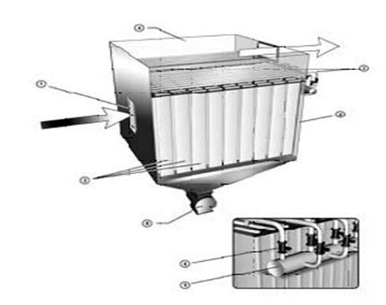 Так как центробежная сила во много раз превосходит силу тяжести, в циклонах осаждается и сравнительно мелкая пыль, с размером частиц примерно 10—20 мкм. Тканевые и бумажные фильтры, а также фильтры в виде слоя коксовой мелочи, гравия или каких-либо пористых материалов (например, пористой керамики) применяют для очистки газов посредством фильтрации. Наиболее распространёнными газоочистителями такого типа являются тканевые мешочные, или рукавные, фильтры. В зависимости от характера пыли и состава газа мешки изготовляют из шерстяной, хлопчато-бумажной или специальной (например, стеклянной) ткани. Газ проходит сквозь ткань, а частицы пыли задерживаются в мешках (рукавах). Рукавные фильтры служат главным образом для улавливания весьма тонкой пыли; например, при очистке газов, отходящих от ленточных агломерационных машин или от шахтных печей, в рукавных фильтрах улавливается 98—99% всей пыли. Принцип работы рукавного фильтра следующий (рисунок 6.3): Воздух поступает в фильтр (рисунок слева) по воздуховоду через патрубок (1) в камеру запыленного воздуха (2), проходит через очистные рукава (3), при этом частицы пыли задерживаются на их наружной поверхности, а очищенный воздух поступает в камеру (4) и отводится из фильтра. По мере увеличения толщины слоя пыли на поверхности рукавов возрастает сопротивление движению воздуха и пропускная способность фильтра снижается. Для очистки предусмотрены различные типы систем регенерации запыленных рукавов, наиболее эффективной из которых является система импульсной продувки. К камере запыленного воздуха подключен ресивер сжатого воздуха (5) с электромагнитными клапанами (6). Воздух из ресивера через клапаны поступает в продувочные трубы (7). Регенерация осуществляется кратковременными импульсами сжатого воздуха, поступающего внутрь рукавов сверху через отверстия в продувочных коллекторах. Пыль, отряхиваемая с рукавов, осыпается в бункер и через питатель (8) удаляется из фильтра.