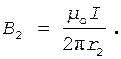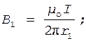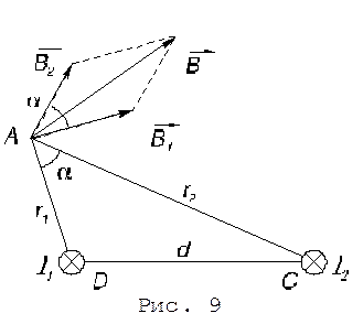 Магнитные индукции В 1 и B 2 выражаются соответственно через силу тока I и расстояния r 1 и r 2 от проводов до точки А: