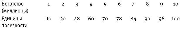 Как хорошо понимал Фехнер, он не первый пытался найти функцию, связывающую психол огическую интенсивность с физической силой стимула. В 1738 году швейцарский ученый Даниил Бернулли предвосхитил объяснения Фехнера и применил их к отношениям между психологической ценностью или желательностью денег (сейчас называемой «полезность») и реальным количеством денег. Он утверждал, что подарок в 10 дукатов обладает той же полезностью для человека, уже имеющего 100 дукатов, что и 20 дукатов – для обладателя 200 дукатов. Бернулли был прав, разумеется: мы обычно говорим об изменениях дохода в процентах, например, когда говорим «ей дали 30 % прибавки». Идея в том, что 30 %-ная надбавка вызывает схожую психологическую реакцию у богатого и бедного, а прибавка 100 долларов – нет. Как в законе Фехнера, психологическая реакция на изменение размера богатства обратно пропорциональна исходному капиталу; отсюда следует вывод, что полезность – логарифмическая функция богатства. Если функция точна, одна и та же психологическая дистанция отделяет 100 тысяч долларов от 1 миллиона, а 10 миллион ов – от 100 миллионов долларов. «80 %-ная вероятность выиграть 100 долларов и 20 %-ная вероятность выиграть 10 долларов» Теперь спросите себя: что вы предпочли бы получить в подарок – такую игру или гарантированные 80 долларов? Почти все выберут гарантированные деньги. Если бы человек подсчитал неопределенные перспективы по ожидаемой ценности, он выбрал бы игру, поскольку 82 доллара больше, чем 80. Бернулли указал, что в действите льности игры так не оценивают.