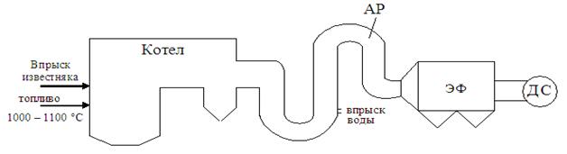 Күкiрт екi тотығының бiр бөлiгi жанарғыда түзілген СаО-мен қатысады, бірақ бұл кезеңде көп бөлігі әлі қатыспайды. Қатыспаған кальций түтіндік газдардың ылғалдылығын жоғарылату жолымен бөлек реакторда активтендіріледі (5.3 сурет). Судың тозаңдануы, кальцидің қолдану коэффициентін барынша жоғарлату мүмкіндік беретін, реакцияға қатыса алатын шарттарды жасайды. СаО + Н2О → Са(ОН)2 Са(ОН)2 + SО2 → СаSО3↓ + Н2О Са(ОН)2 + SО2 + Реакцияның өнiмi - көмiрдiң жағуы кезінде ұшпа күлмен араласып және ЭФ-да түтіндік газдардан жойылатын құрғақ ұнтақ. Түтiндік газдарды суландыруы ЭФ жұмысының тиімділігін жақсартады, соның нәтижесінде ЭФ-тан шыққан шаңды шығарулардың дәрежесі, бір көмірді жақан кезден қарағанда төмен болады. Артықшылығы: қарапайымдылығы, циркуляциясы жоқ, ағын сулар болмайды, соңғы өнім құрғақ болады, күкіртті газдың ұсталу дәрежесі жоғары 45-90 %, әр түрлі отын түрінде жұмыс істейді, қазандық типінен тәуелсіз, көп орын алмайды, үнемділік, шағын инвестициялық шығындар, арзан сорғыштың-ізбестастың пайдаланылуы. Кемшiлiктері: қыздыру беттерінде мықты шөгінділердiң және кальций сульфатының қалыптасуы. Магнезитті циклдiк тәсiл. Тәсiлдiң мәнi: Күкірт диоксидінің магний оксидінің (магнезитпен) суспензиясымен байланысы келесі реакция арқылы анықталады