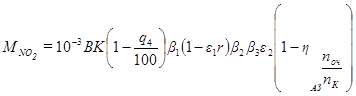 Мұндағы В - отын шығыны, г/с, т/жыл; К- азот шығысын сипаттайтын коэффициент (кг/гр ш.о). Бу өндiргіштігі Д 200т/сағ тең және одан жоғары болатын, газ және мазутты жағу кезінде жүктемелердің барлық ауқымындағы қазандар үшiн арналған