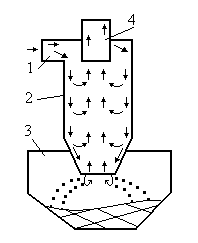 6.9- сурет – Аэрофильтрдегі лектің ағу сызбасы Аппарат өндірістік сынақтан Павлодардың 1-ТЭЦ-інде өтті. Мұнда аппарат ауа жылытқыштардың эрозиялық тозуының алдын алу мақсатында БКЗ-420 -140 қазандығының ортасында сулы экономайзердің екінші сатысы мен ауа жылытқыштардың екінші сатысының арасына орналастырылды және ол оң нәтиже көрсетті: тозаңнан тазалаудың жорамалданған 40% - ының орнына 65-70% -ға қол жетті. 4 жыл бойы Екібастұз көмірінің жоғарғы дәрежелі күлімен жұмыс істеген өндірістік құрылғыны эксплутациялау аэрофильтрің толық эрозиялық қауіпсіздігін дәлелдеді. Техникалық газдарды тозаңдармен артық бөлшектерден тазартуға және көп компонентті газ қоспаларын бөлшектеуге арналған тағы бір құрылғы – градиентті сепаратор. Тазалаудың градиенттік тәсілінде жедел айналмалы лекте қозғалатын бөлшектерге әсер ететін градиентті күш пайдаланылады, ол газ тазалаудың тиімділігін арттыруға және күл ұстағыштың жұмысын 100% - ға дейін арттыруға мүмкіндік береді. Градиентті сепаратордағы (6.10- сурет) сепарациялық арна параболалық конфузордан және диффузордан, олардың арасындағы бұрағыш сопламен орындалған. Конфузор мен диффузордың профилі мына мәнді сақтай отырып дайындалған: dFi / dLi = const, мұндағы dFi - конфузор мен диффузордың і саңылауының аумағы; dLi - конфузор мен диффузордың і учаскесінің ұзындығы.