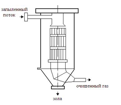 6.7 сурет – Тікелей циклон Күл ұстаудың тиімділігін арттыру үшін кіші диаметрі 250 мм-ге тең циклондардан құралған батареялы циклондар қолданылады. Циклондық элементтер бір корпусқа біріктірілген, газдарды әкеледі және әкетеді және құрама бункері бар. Батареялы циклонның корпусы ауыспалы жүктемелі циклондық элементтерде газдың оңтайлы жылдамдықтарын сақтау үшін секциялы түрде қажетті секциясын ажырату жолымен орындалады. Сонымен қатар секциялау газдардың бір элементтен басқа тозаң бункеріне ағуы есебінен газ тазалау деңгейінің нашарлау мүмкіндігінің азаюына мүмкіндік береді. Батареялық циклондар газдардың аксиальды әкеліну элементтері мен күректік айналдырғыштан, тангенциальды газдарды әкелгіштерден құрастырылады. Бірақ барлық элементтері біркелкі типте болуы керек. Гидравликалық қарсылы 500-700 Па. Батареялық циклонның маркировкасы: 4х14xm. Бұл төрт секциялы аппараттың тереңдікке 14 элементтерімен және ені бойынша m элементі болатынын білдіреді. m = 7 ¸ 24