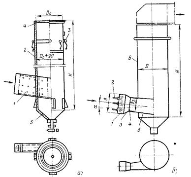а-орталық жүру скрубері; 1-тозаңданған газдың кіру түтікшесі; 2-күл ұстағыштың корпусы;3-суарғыш сопла, 4-тазаланған газдың шығар аузы;5-бункер; б-Вентури коагуляторлы күл ұстағыштар; 1- тозаңданған газдың кіру түтікшесі;2-судың суару сопласы арқылы берілуі;3,4,5-конфузор, кірер ауыз және Вентури коагуляторының диффузоры; 6- скруббер- тамшы ұстағыш. 6.11-сурет. Дымқыл күл ұстағыштар