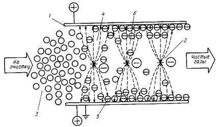 1-тұндырғыш электрод; 2-короналайтын электрод; 3-күл бөлшектері; 4-электрлі алаң; 5-тұндырылған күл қабаты; 6- қуатталған күл. 6.12 б –электрлі сүзгі жұмысының принципі «Кері корона» аймағында пайда болған оң иондар короналанған электродтарға қарай қозғалады және өз жолындағы күлдің кері қуаттандырылған бөлшектерін бейтараптандырады. Нәтижесінде күл бөлшектері түтін мұржасына ұшады, тұтынылатын ток артады, электродтардағы қуат төмендейді, күл ұстағыштардың тиімділігі артады. Күл ұстау деңгейіне электрлі сүзгі саңылауы бойынша булы газдардың тарау алаңының біркелкілігі әсер етеді. Булы газдардың біркелкі жылдамдық алаңын құру үшін электрлі сүзгінің кірер жеріне газ таратқыш торлар орнатады. Электрлі сүзгінің кемшіліктері: жоғарағы қаржылық шығындар, металл сыйымдылығы, электрмен қуаттандыру үшін арнайы көтеру түзету агрегатының қажеттігі, үлкен аумақты алуы, жарылғыштық қаупі бар тозаң үшін электрлі сүзгінің пайдаланылмауы.