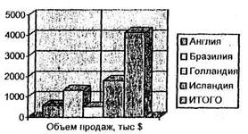 Рис 9. Диаграмма продаж компьютера 2. На вкладке "Положение рисунка" с помощью кнопок выбора установите: ¤ "по горизонтали: выравнивание по центру относительно колонки"; <¤> "по вертикали: положение 1 см ниже строки"; • нажмите кнопку <ОК>дважды; диаграмма переместится в средину экрана и расположится ниже таблицы. 3. Выделите диаграмму двойным щелчком мыши так, чтобы вокруг нее образовалась рамка из штриховых наклонных линий; и уберите появившуюся таблицу с помощью кнопки <Х>; § щелчком мыши выделите левыйстолбец диаграммы и с помощью кнопки <Цвет заливки> на панели инструментов Рисование окрасьте столбец в какой-нибудь цвет(например, красный); а затем аналогичным способом окрасьте другие столбцы диаграммы в различные цвета; § щелчком мыши выделите заднюю стенку диаграммы и окрасьте ее в какой-нибудь цвет(например, светло-голубой). § щелчком мышии стороне от диаграммы снимите выделение.