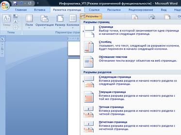 Рис. 6. Окно вставки разрывов. Ø вставить титульную страницу в меню программы выбрать вкладку Вставка, в разделе «Титульная страница» определить стиль титульной страницы Вставка®Титульная страница®…