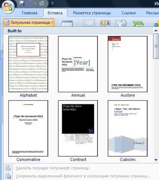 Рис. 7. Окно стилей титульных страниц документа. Ø вставить номера страниц в меню программы во вкладке Вставка, в разделе «Колонтитулы» выбрать команду «Номер страницы» Вставка®Колонтитулы®Номер страницы…