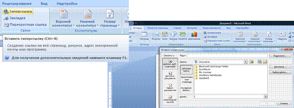 Рис. 9. Окно вставки гиперссылки. Ø вставить оглавление (содержание) в меню программы открыть вкладку Ссылки, в разделе «Оглавление» выбрать «Оглавление», в появившемся окне выбрать тип оглавления или открыть диалоговое окно «Оглавление» и самостоятельно задать параметры заполнителя, форматов, уровней оглавления Ссылки®Оглавление®Оглавление®…
