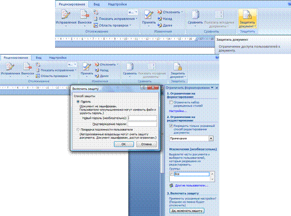 Рис. 17. Окно защиты документа. Ø снять защиту документа от несанкционированного изменения в меню программы во вкладке Рецензирование в разделе «Защитить/Защитить документ» выбрать «Снять защиту», при запросе программы ввести пароль (в случае отсутствия пароля защита снимается автоматически) Рецензирование®Защитить документ®Снять защиту®… Ø преобразовать текст в таблицу выделить преобразуемый текст, в меню программы выбрать вкладку Вставка, в разделе «Таблица» выбрать «Преобразовать текст в таблицу», в появившемся окне «Вставка таблицы» задать количество строк и столбцов таблицы Вставка®Таблица®Преобразовать текст в таблицу® Вставка таблицы Ø скрыть границы таблицы поместить курсор в таблицу (щелкнуть по таблице левой кнопкой мыши), во вновь появившемся меню Работа с таблицами (правая часть меню программы) выбрать вкладку «Конструктор», в разделе «Стили таблиц» выбрать «Границы», в появившемся окне выбрать команду «Нет границы» Работа с таблицами®Конструктор®Стили таблиц® Границы®Нет границы